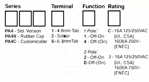 If you’re looking at an E-Switch data sheet, the function stated within parenthesis indicates a momentary function. For example, you can order the PA4 Series pushbutton switch as either momentary or latching. If you’re looking at the single-pole version, the “Off-On” function denotes the latching version while the “Off-(On)” is the momentary function. The same holds true for the two-pole version.
